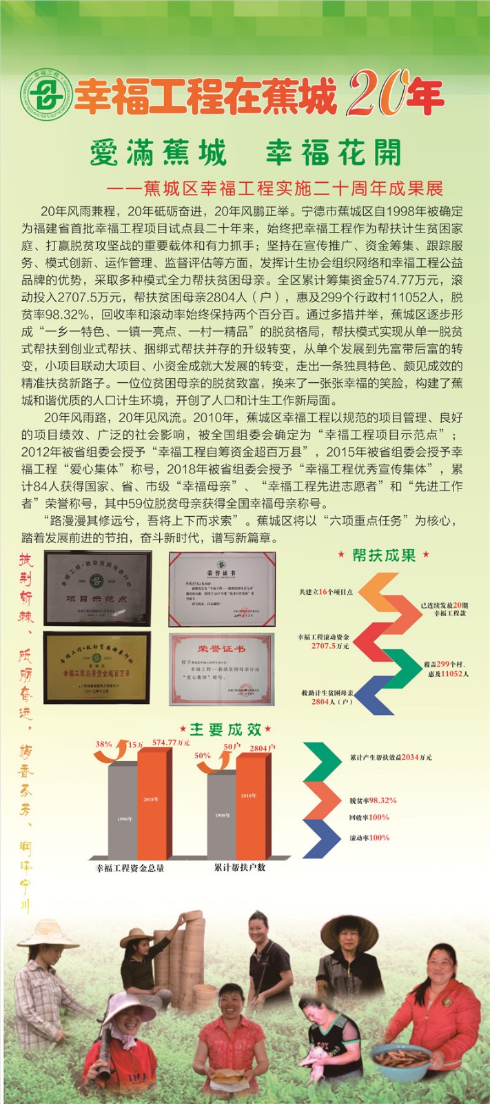 幫助困境母親,建設幸福家庭2018年“母親節”期間,蕉城區計生協會、區幸福工程項目辦制作的《幸福工程在蕉城20年——愛在蕉城·幸福花開》大型幸福工程宣傳展板,在寧德市區中心萬達廣場展出。