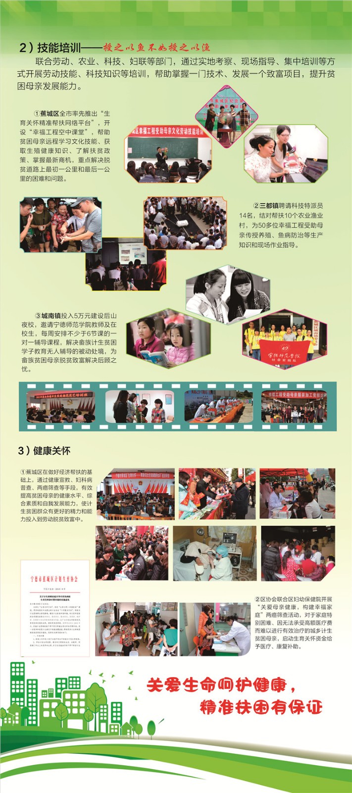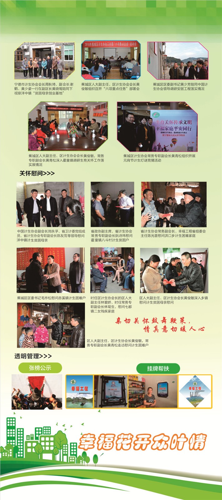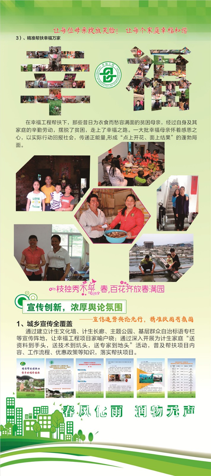 第四板塊:宣傳創新。主要反映蕉城區通過建立計生文化墻、計生長廊、主題公園、基層群眾自治標語專欄等宣傳陣地,讓幸福工程項目家喻戶曉;通過深入開展為計生家庭“送資料到手頭,送技術到炕頭,送專家到地頭”活動,普及幫扶項目內容、工作流程、優惠政策等知識,落實幫扶項目;通過“母親節”,“‘ 5.29’會員活動日”等重大紀念日,提供健康、就業、創業等無償服務;通過向各大報刊、雜志、網絡、電視等媒體積極投稿,反映我區開展幸福工程幫扶工作的典型經驗和優秀成果,擴大影響力,樹立好形象。