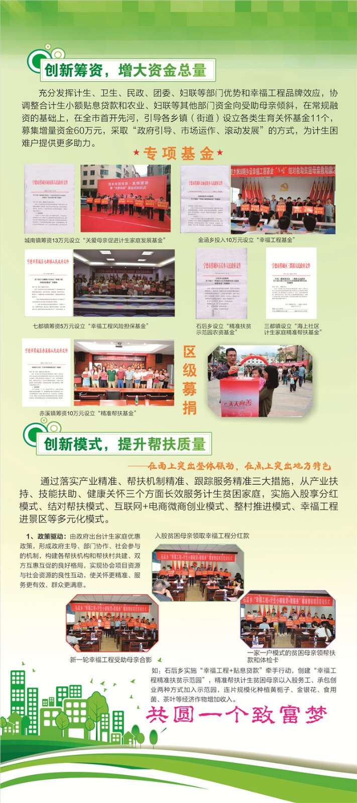 第二板塊:籌資創新。主要反映蕉城區在全市首開先河,充分發揮計生、衛生、民政、團委、婦聯等部門優勢和幸福工程品牌效應,協調整合計生小額貼息貸款和農業、婦聯等部門資金向受助母親傾斜,在常規融資的基礎上,引導各鄉鎮(街道)設立各類生育關懷基金11個,募集增量資金60萬元,采取“政府引導、市場運作、滾動發展”的方式,為計生困難戶提供更多助力的創新舉措。