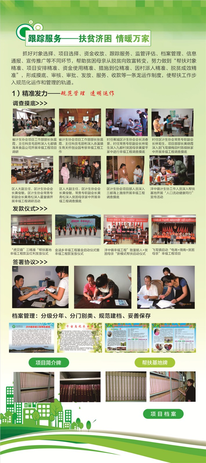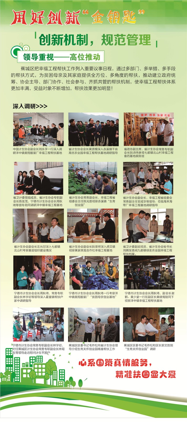 第一板塊:機制創新。主要反映各級黨委、政府和社會各界重視幸福工程工作,各級計生協會幸福工程工作者、志愿者們心系計生貧困家庭,主動承擔、積極作為,不斷適應新形勢、新要求,探索創新幫扶模式,在政策、資金、技術、信息和就業等方面全面幫扶貧困母親,持續推進幸福工程新發展的救助實錄。