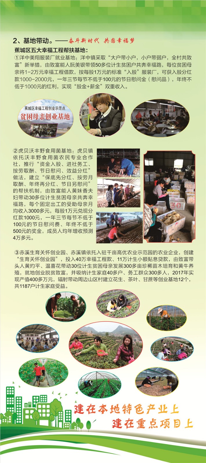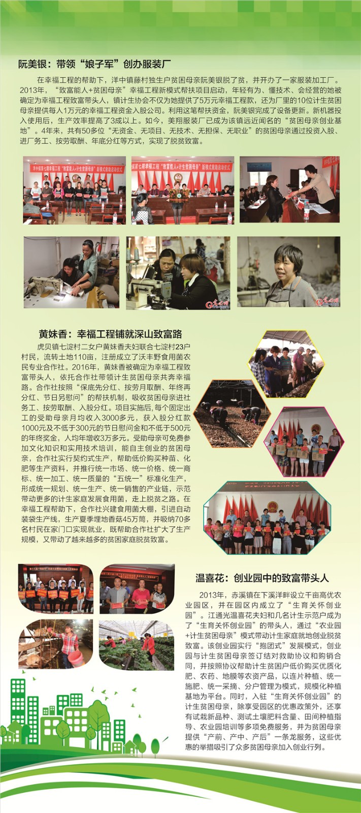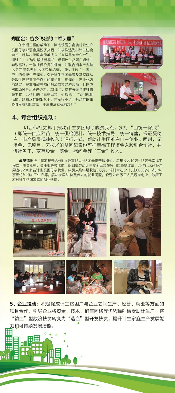 第三板塊:模式創新。主要反映蕉城區通過落實產業精準、幫扶機制精準、跟蹤服務精準三大措施,從產業扶持、技能扶助、健康關懷三個方面長效服務計生貧困家庭,實施入股享分紅模式、結對幫扶模式、互聯網+電商微商創業模式、整村推進模式、幸福工程進景區等多元化幫扶模式。重點展示蕉城五大幸福工程幫扶基地和6位脫貧母親勇當致富帶頭人、示范帶動計生貧困家庭發展生產共同致富的幫扶實況。一張張受助母親擺脫貧困、發家致富后的幸福生活照,折射出了蕉城區幸福工程“點上開花、面上結果”的蓬勃局面。