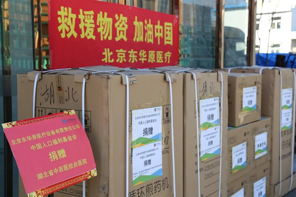 News2020年2月22日,北京東華原醫療設備有限責任公司向中國人口福利基金會捐贈一批價值154500元的醫用物資,用于湖北省醫療機構的疫情防控工作。此批物資包含血壓儀、中藥煎藥機、中藥包裝機數臺,已于2月24日下午運抵湖北省中西醫結合醫院,并投入使用。