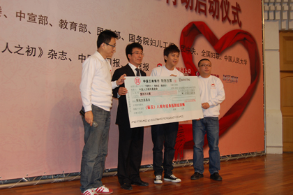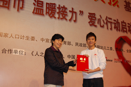 2009 年 12 月 16 日 ,由中國人口福利基金會主辦,國家人口計生委、中宣部、教育部、民政部、國務院婦兒工委、團中央、全國婦聯、中國人民大學等單位支持的《鄧超牽手陽光女孩基金暨“幸福圍巾·溫暖接力”愛心行動啟動儀式》在北京中國人民大學逸夫第一報告廳舉行。國家人口計生委、教育部、民政部、國務院婦兒工委、團中央、全國婦聯、中國人民大學的領導,北京八所高校的志愿者團隊代表,新聞媒體及部分愛心人士出席了啟動儀式。影視明星鄧超牽手“陽光女孩”,出任基金形象代言人,并代表話劇《翠花》劇組向“陽光女孩”基金捐款 10 萬元人民幣,同時,《人之初》雜志也向陽光女孩基金捐款 10 萬元。“幸福圍巾·溫暖接力”活動作為“陽光女孩”基金首次公益活動同時啟動。
