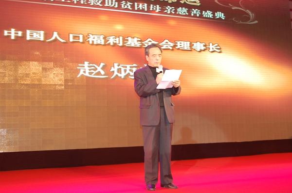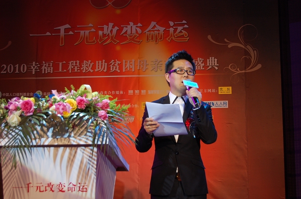 中國人口福利基金會理事長趙炳禮代表主辦方進行致詞。他講到,幸福工程于 1995 年成立, 14 年來,幸福工程以救助貧困母親為宗旨籌集善款 6 億余元,幫助 22.1 萬個貧困母親和她們的家庭擺脫了貧困,惠及人口 101 萬人。母親是最偉大的,而生活在偏遠地區的貧困母親們更是如此。她們吃苦最多,付出最多,享受最少。“千元改變命運”就是要給貧困母親一個支點,給她們一個希望,給她們一個機會。接下來,慈善盛典 的承辦方、 發起人 、幸福工程志愿者劉亞桐先生 致辭 ,談到了他發起這次盛典的緣由并表達了對愛心人士的感謝。