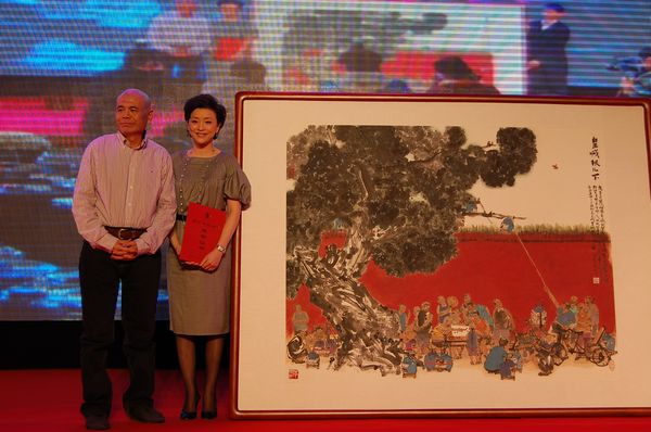 幸福工程形象大使馬艷麗為拍得《荷花》的羅杰先生頒獎(jiǎng)