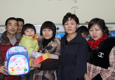 圖:趙總慰問來自漢中的小女孩(小女孩的父母都是小學老師,父親為了給孩子治病,日夜操勞,不幸得了胃癌,為做手術借了不少錢。當得知有愛心企業愿意幫助孩子免費治療康復的消息,全家特別感謝!左一為身體還很虛弱的父親)