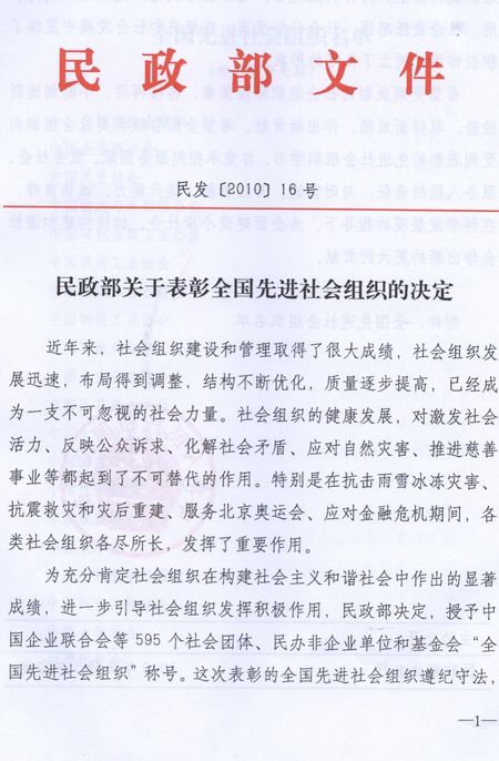 2月4日,民政部印發《民政部關于表彰全國先進社會組織的決定》(民發[2010]16號),授予中國人口福利基金會“全國先進社會組織”稱號。此次受到表彰的全國性基金會還有中國紅十字基金會、中國青少年發展基金會、中國婦女發展基金會等12家基金會。表彰決定指出,這次表彰的全國先進社會組織遵紀守法,組織機構健全,內部制度完善,運作程序規范,黨團組織發揮作用,社會責任感強,社會公信度高,在經濟和社會發展中發揮了積極作用,樹立了良好的形象。