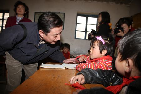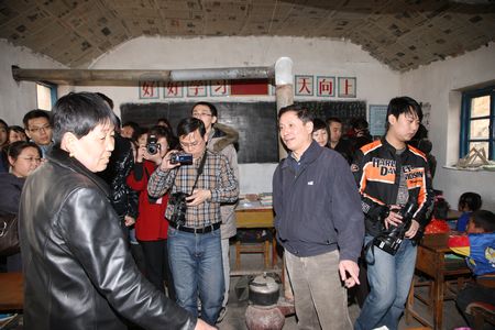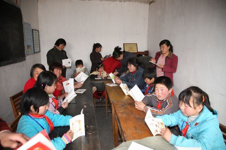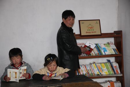 駱駝山溝小學(xué)帶領(lǐng)24個(gè)學(xué)生的張老師在高興地翻閱送到的書籍