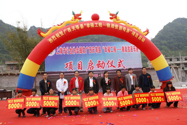 幫助困境母親,建設幸福家庭近日,上海市計生協(xié)會援助天等縣“幸福工程·救助貧困母親”項目在天等鎮(zhèn)郎明村郎屯正式啟動。 30 位計劃生育貧困母親得到了 15 萬元的幸福工程項目救助資金。