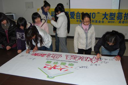 同學們紛紛在"幸福書屋 愛自2010"愛心大旗上簽字留念