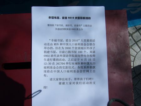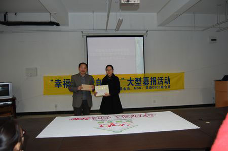 “幸福書屋 愛自2010”項目自啟動以來,得到了社會各屆愛心人士尤其是廣大網民朋友的大力支持,目前已募集善款50余萬元。4月13日至15日華北電力大學外國語學院班長陳丹霓組織全班共17名學生在校園開展了募捐活動,來自學校外國語學院、電氣與電子工程學院、經濟與管理學院、國際教育學院等10個班級的學生奉獻了愛心,共籌集善款901.60元。