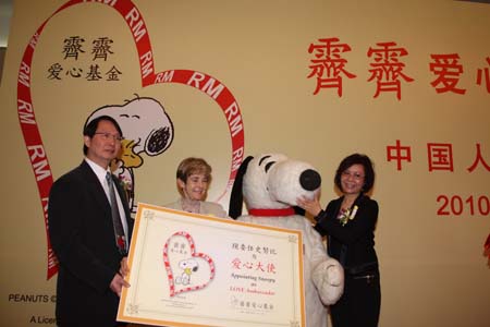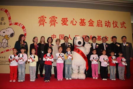 幫助困境母親,建設(shè)幸福家庭2010 年 4 月 21 日 ,由霽霽企業(yè)( SNOOPY 史努比亞太地區(qū)授權(quán)商)發(fā)起, 中國人口福利基金會主辦的霽霽愛心基金啟動儀式在北京人民大會堂舉行。