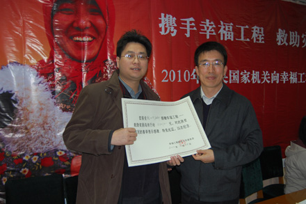 幫助困境母親,建設幸福家庭2010年中央國家機關向幸福工程捐款(右一為基金會秘書長楊文莊)