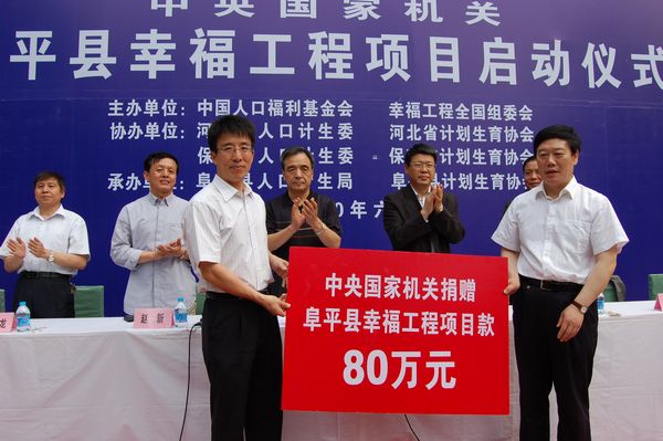左一國務(wù)院機(jī)關(guān)事務(wù)管理局扶貧辦主任孫景龍,左二河北省人口計(jì)生委主任趙新,左三中國人口福利基金會(huì)理事長趙炳禮,左四國務(wù)院機(jī)關(guān)事務(wù)管理局副局長李寶榮,左五國務(wù)院機(jī)關(guān)事務(wù)管理局后勤改革與綜合管理司司長李黎,左六中國人口福利基金會(huì)秘書長楊文莊