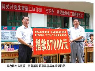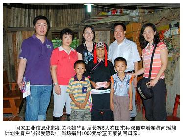 在自治區(qū)計生協(xié)和國家幸福工程組委會辦公室的協(xié)調(diào)下, 9 月 14 日,國家工業(yè)和信息部、國家機(jī)關(guān)計劃生育第十一協(xié)作組赴廣西區(qū)開展“三下鄉(xiāng)”活動。張雄華副局長等 21 人在自治區(qū)人口計生委副主任李廣和百色市委副書記詹成付的陪同下前往田東縣祥周鎮(zhèn)隴造村舉行了“幸福工程—救助貧困母親行動”捐款儀式,儀式結(jié)束后還分別走訪慰問瑤族計劃生育戶并送去慰問金。