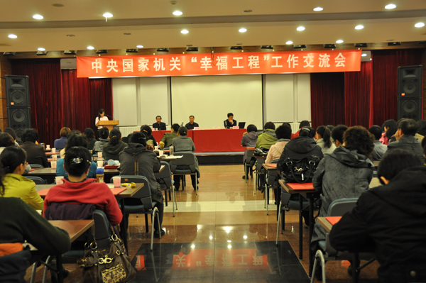 幫助困境母親,建設幸福家庭10 月 22 日 ,由中央國家機關人口計生委組織的“中央國家機關幸福工程工作交流會”在京召開。 國務院機關事務管理局后勤改革與綜合管理司司長李黎、副司長陳占國出席交流會。 中國人口福利基金會副理事長兼秘書長、幸福工程辦公室主任楊文莊應邀出席。中央國家機關九十多個部委近百名計劃生育干部參加了交流會。