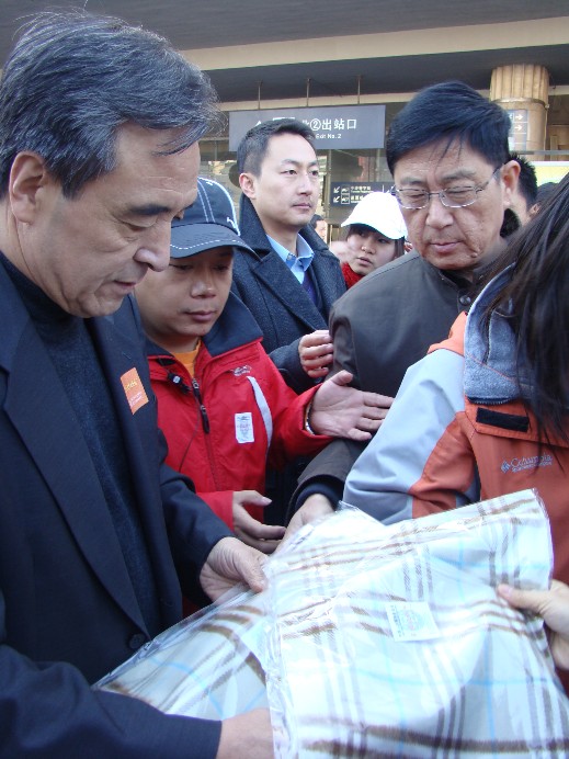 趙炳禮理事長向現(xiàn)場群眾捐贈圍巾