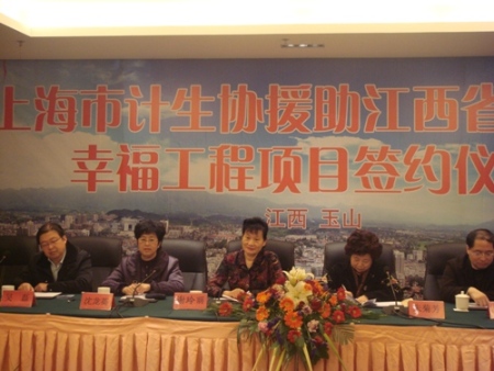 12月10日,上海市計生協援助江西省建立幸福工程項目簽約儀式在上饒市玉山縣舉行。江西省人口計生委巡視員、省計生協常務副會長朱菊芳和上饒市市委常委、紀委書記趙力平分別代表省人口計生委、計生協和上饒市市委、市政府致辭,玉山縣政府副縣長、縣計生協會長王其中介紹了玉山縣幸福工程項目的籌建情況,上海市計生協、江西省計生協、上饒市計生協、玉山縣計生協四方共同簽署了幸福工程項目協議書。