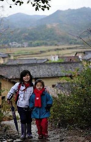 山區(qū)留守女孩走在泥濘的鄉(xiāng)間小路