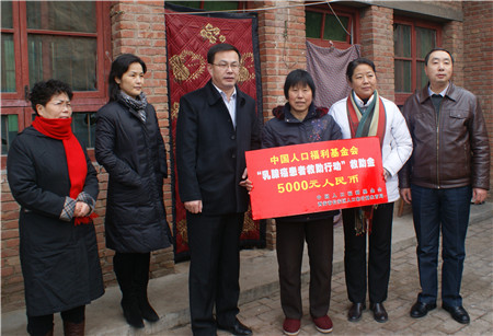 幫助困境母親,建設幸福家庭2011 年 1 月 20 日 ,西安市長安區引鎮東堡子村村民屈孝芹家里來了一批特殊的客人:中國人口福利基金會“乳腺健康宣教診治中心”項目辦執行主任王剛,西安市人口和計劃生育委員會主任衛冬梅、副巡視員劉菊香,長安區計生局局長劉志敏、副局長劉平、區計生服務中心主任劉秀霞,引鎮街道辦事處副主任徐學斌一行來到她家,為她送去 5000 元乳腺癌患者救助金。這是“乳腺癌患者救助基金”救助的第一位陜西省乳腺癌患者。
