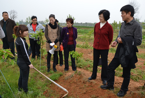 考察團(tuán)一行來(lái)到羅鋪墾殖場(chǎng),考察“幸福工程”綠色養(yǎng)老林項(xiàng)目。墾殖場(chǎng) 2009 年開(kāi)始實(shí)施“幸福工程”,場(chǎng)里承包 50 畝旱地給 16 位貧困母親開(kāi)發(fā)種果,縣里從“綠色養(yǎng)老”專項(xiàng)資金中撥付 8 萬(wàn)元給她們購(gòu)買樹苗和化肥。在技術(shù)人員的帶動(dòng)下,她們當(dāng)年底全部栽上了沙禮特晚秋黃梨和沙田柚。預(yù)計(jì) 2012 年開(kāi)始掛果,到時(shí)這 16 位貧困母親每年可得到承包轉(zhuǎn)讓費(fèi) 6 萬(wàn)元。