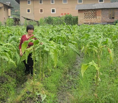 圖片一:戴雪蓮在自家的煙田采摘煙葉。