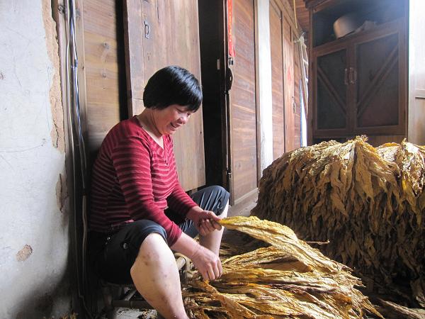 圖片二:戴雪蓮對烘烤好的煙葉進行等級挑選。