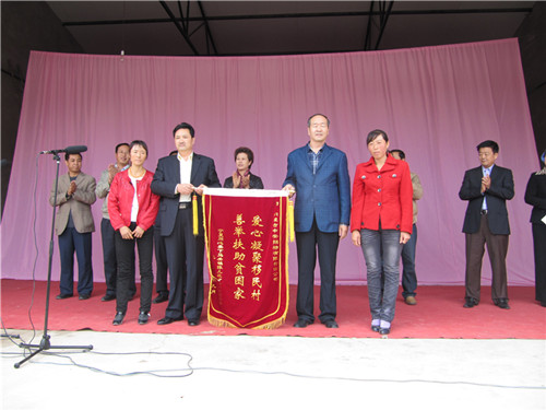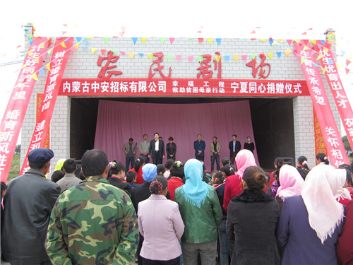 9 月 20 日 ,通過幸福工程全國組委會牽線搭橋,內蒙古中安招標有限責任公司董事長楊恩寬、總經理楊向欣在自治區人口計生委副主任白秀榮、自治區計生協會專職副會長、秘書長張磊、縣人民政府副縣長杜少忠、縣政協副主席李玉山的陪同下,帶著中安人的愛心,千里迢迢來到同心縣下馬關鎮陳兒莊移民新村,為孫志玲等 50 名貧困母親捐贈 10 萬元救助款,幫助她們發展家庭經濟。受救助的貧困母親向楊恩寬董事長贈送了 “愛心凝聚移民村 善舉扶助貧困家”錦旗,以表達深深的謝意。