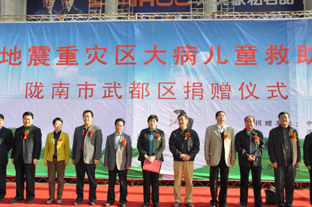 2011年11月10日,由中國人口福利基金會與深圳市慈善會聯合開展的“汶川地震重災區大病兒童救助項目”捐贈儀式在甘肅省隴南市武都區舉行。我會副秘書長藍野、甘肅省計生協專職副會長何堅明、隴南市委常委、宣傳部長張昉、隴南市人口計生委副主任李建勇等領導出席活動。