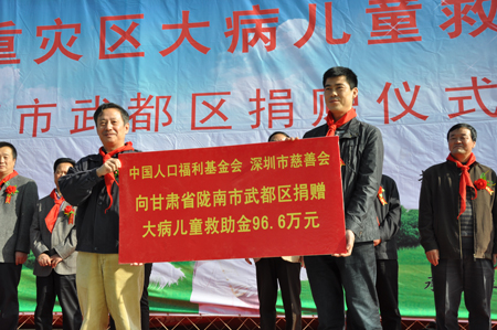“汶川地震重災區大病兒童救助項目”在甘肅省隴南市武都區、康縣、文縣、甘南州舟曲縣4個重災區開展,其中,為武都區114名大病患兒援助救助金96萬余元。