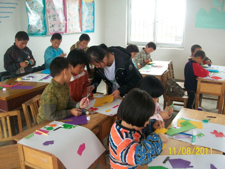在志愿者活動(dòng)期間,大學(xué)生志愿者教孩子們音樂(lè)、舞蹈、手工剪紙、趣味英語(yǔ)等,還跟孩子們一起做游戲,為他們送來(lái)文具、糖果等小禮物。孩子們?cè)谫N紙上寫(xiě)下自己的愿望,有的小朋友寫(xiě)到:“我希望長(zhǎng)大后也當(dāng)志愿者”、“我希望多上音樂(lè)課”!
