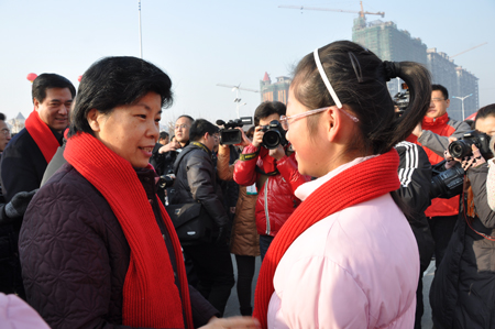 為了傳遞關懷與關愛,陽光女孩基金“幸福圍巾 溫暖接力”隨“三下鄉”活動走進山東臨沂,捐贈2000條圍巾,將溫暖送到革命老區兒童身邊。活動過程中,國家人口計生委副主任崔麗、宣教司司長張建、中國人口福利基金會副秘書長藍野等領導,親自為老區女孩戴上飽含社會關愛的圍巾,并鼓勵她們好好學習,健康成長,為建設老區做出應有的貢獻。