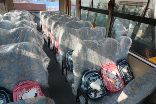 宇通在每輛校車的座位上為孩子們準備了一個裝了文具和糖果的書包