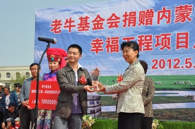 幫助困境母親,建設(shè)幸福家庭2012 年,老牛基金會(huì)捐贈(zèng)“幸福工程—救助貧困母親行動(dòng)” 100 萬(wàn)元,選定在新疆兵團(tuán)農(nóng) 4 師 64 團(tuán)和內(nèi)蒙古興安盟科右中旗設(shè)立項(xiàng)目點(diǎn)。 5 月 10 日,母親節(jié)前夕,內(nèi)蒙古興安盟科右中旗幸福工程項(xiàng)目點(diǎn)啟動(dòng)儀式在興安盟楓葉廣場(chǎng)舉行。幸福工程從老牛基金會(huì)捐贈(zèng)款中拿出 45 萬(wàn)元,科右中旗政府配套 45 萬(wàn)元,在科右中旗吳龍寶嘎查建立扶貧項(xiàng)目點(diǎn),資助 90 位貧困母親,每人 1 萬(wàn)元,開展有機(jī)小米、苞谷等農(nóng)作物種植。下午,老牛基金會(huì)與人基會(huì)一行到科右中旗吳龍寶柳條溝探訪了受助母親家庭。
