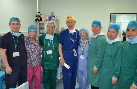 楊文莊副理事長兼秘書長與周會長探望即將接受手術的唇腭裂患兒