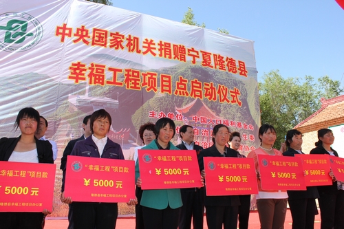 幫助困境母親,建設幸福家庭2012年6月16日,寧夏回族自治區固原市隆德縣幸福工程項目啟動儀式在隆德縣溫堡鄉老莊村舉行。中央國家機關二十三位捐贈代表,在國務院機關事務管理局陳占國副司長的帶領下,出席了項目啟動儀式,并將50萬元善款捐贈給當地100戶貧困母親家庭,幫助她們發展中藥材種植業。