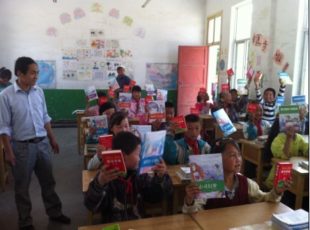 伍仲小學學生們手持幸福書屋捐贈的新華字典