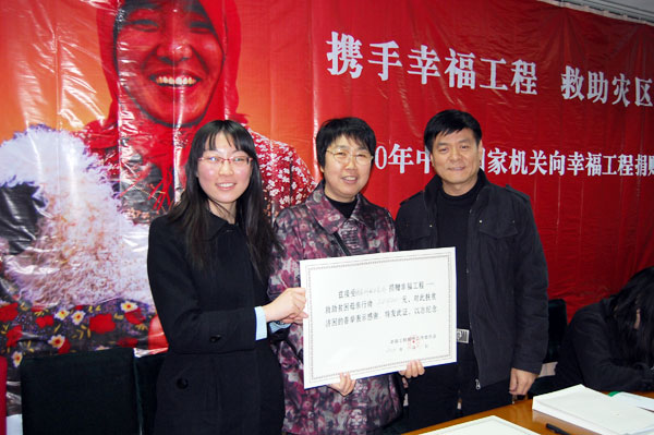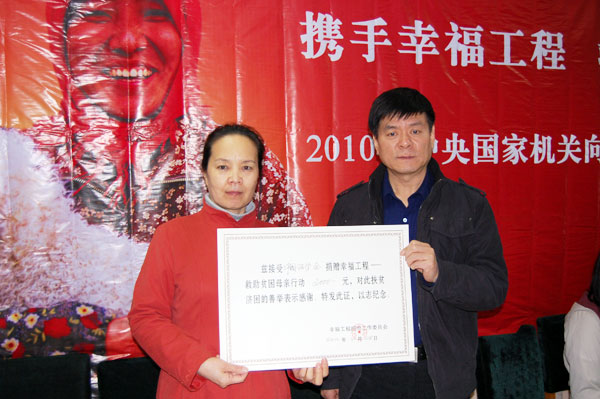 今年的捐款還將按照幸福工程的運(yùn)作模式,用于西部貧困地區(qū)開展救助貧困母親項(xiàng)目,幸福工程組委會(huì)將嚴(yán)格管理善款,扎實(shí)開展工作,救助更多的貧困母親。感謝中央國(guó)家機(jī)關(guān)廣大干部職工的無私奉獻(xiàn)和愛心支持。