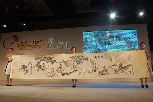 1.高圓圓捐贈印有其肖像的環保手提袋2.《美麗俏佳人》主持人以3.5萬元拍得手提袋3.北京中聯國興書畫院捐贈的畫作《群賢雅聚》拍得4.4萬元4.北京中聯國興書畫院捐贈的書法《和諧盛世光中耀華》拍得3萬元