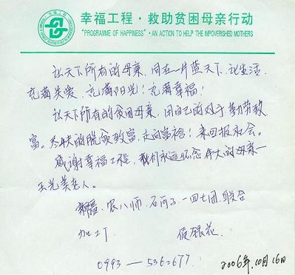 富的還是幸福工程!我如今脫貧致富了,但我沒有忘記在我的身邊還有不少貧困母親,我將盡自己所能,幫助其他貧困母親同我一起脫貧致富。從2004年底開始,我已主動提出不再接受工會和民政部發放的困難補助。從今年起,我還主動為身邊的貧困母親傳授發展家庭養殖業脫貧致富的做法和經驗,2006年在母親節時,我為幸福工程捐款100元,為貧困家庭盡點綿薄之力,同她們一起脫貧致富。真誠地祝愿天下所有的母親同在一片藍天下,生活充滿關愛,充滿陽光,充滿幸福!