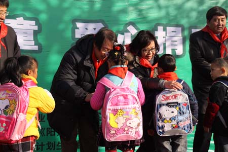 最后出席捐贈儀式的領(lǐng)導(dǎo)和嘉賓向?qū)W生們發(fā)放了書包文具和圖書,并參觀了校園。