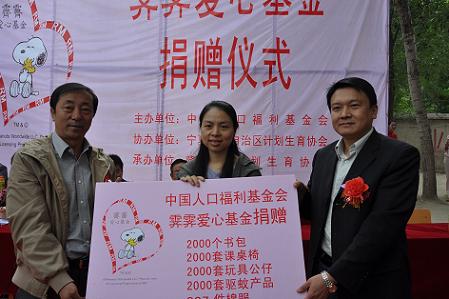News2012年6月14日上午,寧夏回族自治區固原市隆德縣溫堡鄉杜川小學的操場上彩旗飄揚,歌聲嘹亮,同學們用熱烈掌聲歡迎霽霽愛心基金走進寧夏,走進杜川小學。在霽霽愛心基金寧夏捐贈儀式上,中國人口福利基金會副秘書長葛振江、霽霽(上海)貿易有限公司總經理助理陳穎、寧夏回族自治區計生委副主任白秀榮、自治區計生協專職副會長、秘書長張磊、以及固原市、隆德縣等各級領導參加活動。