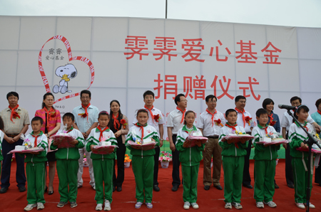陳穎女士代表霽霽愛心基金發言,她說:“我們希望,寒窗苦讀的莘莘學子們不必再為坑洼破舊的桌椅而煩惱,能在明亮的教室中快樂地學習;我們希望,正處于發育階段的孩子們,能背上正規優質的書包,身姿挺拔、茁壯成長;我們還希望,這些小公仔,能讓孩子們在過早地體會到生活的艱辛之余,也能感受到屬于童真時代的快樂。”