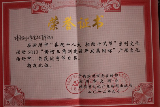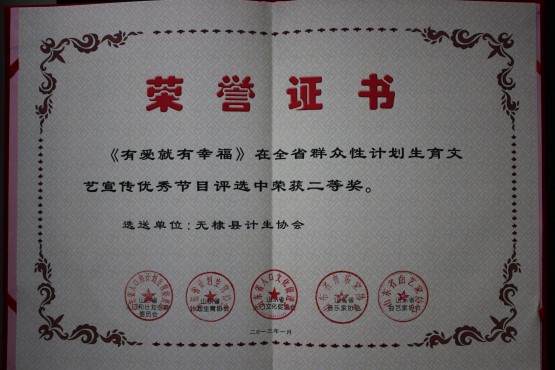 《有愛就有幸福》在2012年濱州市計生委、計生協(xié)會舉辦的《紀(jì)念計劃生育計劃生育基本國策確立30周年暨第23個世界人口日文藝晚會》演出中,榮獲一等獎;在濱州市市委組織部、文明辦、文廣新局舉辦的濱州市“喜迎十八大相約十藝節(jié)”系列文化活動2012“黃河三角洲建設(shè)開發(fā)集團杯”廣場文化活動中,榮獲優(yōu)秀節(jié)目將。2013年1月在全省群眾性計劃生育文藝宣傳優(yōu)秀節(jié)目評選中榮獲二等獎。