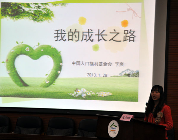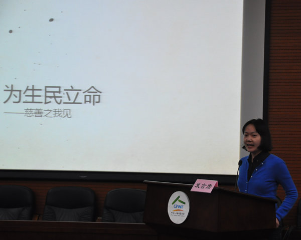 人基會馮冠楠、李爽、陳喆分別作了題為《為生民立命——慈善之我見》、《我的成長之路》、《觸及巔峰》的主題演講,從不同側面和親身體驗,為大家講述了人基會青年同志的心路歷程,展現了良好風貌,體現出團結、和諧、奮進、陽光的團隊精神和“樂活、勤奮、奉獻”的工作理念。