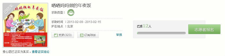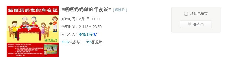 幫助困境母親,建設幸福家庭為倡導“感恩母親,回報母愛”的理念,弘揚中華民族的慈孝文化,今年春節期間,“幸福工程”在新浪微活動和微公益平臺上發起“曬曬媽媽做的年夜飯”活動。網友可以通過上傳自家的年夜飯照片或評論轉發來參與該活動。