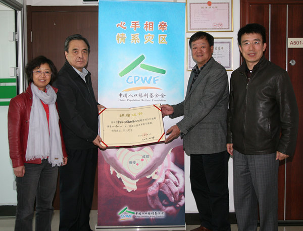23日上午,中國人口福利基金會收到中國人口與發展研究中心全體職工為雅安地震災區捐款12170元。我會理事長趙炳禮代表中國人口福利基金會接收捐款。中國人口與發展研究中心主任姜衛平代表人發中心全體職工接受捐贈證書。中國人口福利基金會副理事長兼秘書長楊文莊、中國人口與發展研究中心副主任劉鴻雁出席捐贈儀式。