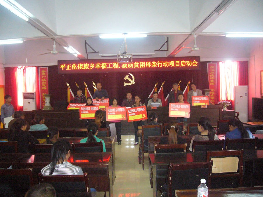2013年6月5日遵義縣平正仡佬族鄉幸福工程--救助貧困母親項目啟動會在平正仡佬族鄉人民政府四樓會議室召開。平正鄉計劃生育協會專副會長主持。23個受助貧困母親、平正鄉計劃生育協會理事會成員、遵義縣海美食品商貿公司代表參會。