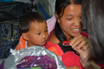 六·一前夕在安順市人民醫院的病房中,中國人口福利基金會“幸福微笑”國際醫療隊員給救助過及等待手術的唇腭裂兒童過了一次別開生面的兒童節,并不遠萬里為小朋友們帶來了小禮物。