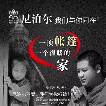 雖然這次受災最嚴重的區域不在中國,但尼泊爾是我們的友好鄰國,我們一樣要伸出援助之手。中國人口福利基金會慈愛基金倡議社會各界愛心企業和人士獻出您們的大愛,幫助尼泊爾這個神秘而古老的佛國和西藏受災地區度過它們最艱難的時刻,我們需要您的參與和支持!一頂帳篷,一個溫暖的家。尼泊爾,我們與你同在!